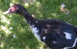 This is Sadie. She is a Muscovy Duck (Cairina moschata). I have written the binomial name in italics but I can’t remember if I did them correctly. Her species is tropical in habitat. She is very social & likes to toss her head back and clap/click her bill when we talk. She loves grubs, snails & bread for treats. She broke her leg & was given to Karin for healing which worked because she can now walk. Karin has clipped her wings a few weeks ago so that she can’t fly. I have worked on getting Sadie’s trust (after letting her loose & chasing her) and she now lets me pick her up.
