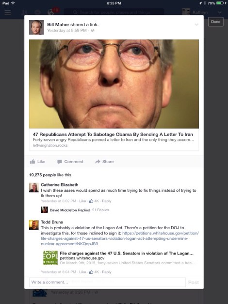 I wanted to print the infamous letter along with the names of the 47 senators but it took such a winding path to get this type of information on my iPad. One post that I wanted to get into stalled and was clearly censored. I screen saved it here: