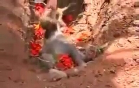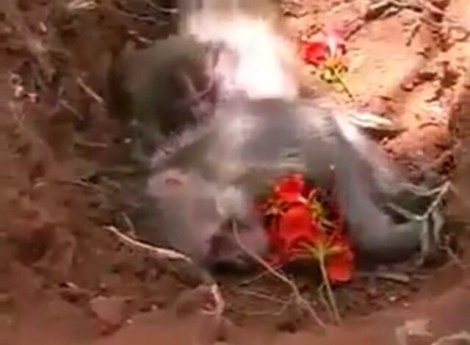 I watched this video and since I didn’t know the language I made up my own story supported by what I observed: a villager on the way to market/town found a mother and child monkey on the side of the road. On curious inspection the mother monkey was found to be dead and her baby in distress. Fellow villagers gathered and inspired by their religious respect for death and new life they prayed and celebrated the mother’s life and allowed the baby to grieve its mother’s passing. A bottle of milk was offered to the baby but seeing that the baby needed more time with its mother the villagers sat and continued their ritual for the dead. With respect a grave was dug and flowers were brought to the gravesite in preparation for the final ritual. As the mother was lowered into her grave and flower pedals sprinkled around and over her body, her baby was allowed its final farewell.