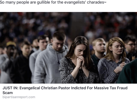 KBP>This shouldn’t be the only evangelical pastor charged with fraud – I’ve seen one that told his “congregation” that Jesus told him in his shower that he could use the store front church collections to pay off his gambling debts instead of saving it toward building a new church. Jesus told him not to worry, more tithes would be coming in. No one batted an eyelid. Instead, in unison, they all raised their arms, my sister included, and called out, “Praise the Lord!” The hair on the back of my head rose and I got goosebumps – I couldn’t get out of that church fast enough. True story, Bristol, CT, mid 1980s.